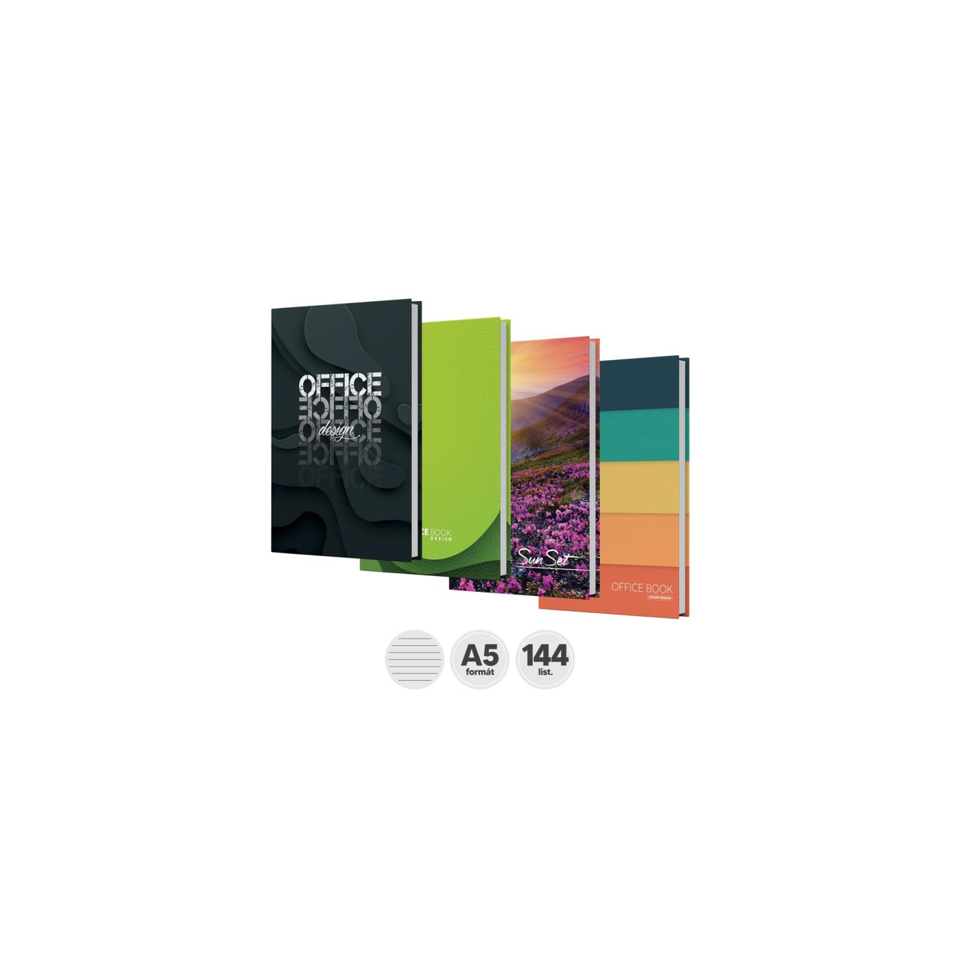 Záznamové knihy A5 sú vyrobené z bezdrevného písacieho papiera. Kniha má lepeno- šitú väzbu. Obálka je vyrobená z tvrdého kartóna, ktorý je potlačený rôznymi farebnými motívmi a potiahnutý laminom. Linajková - 144 listov.